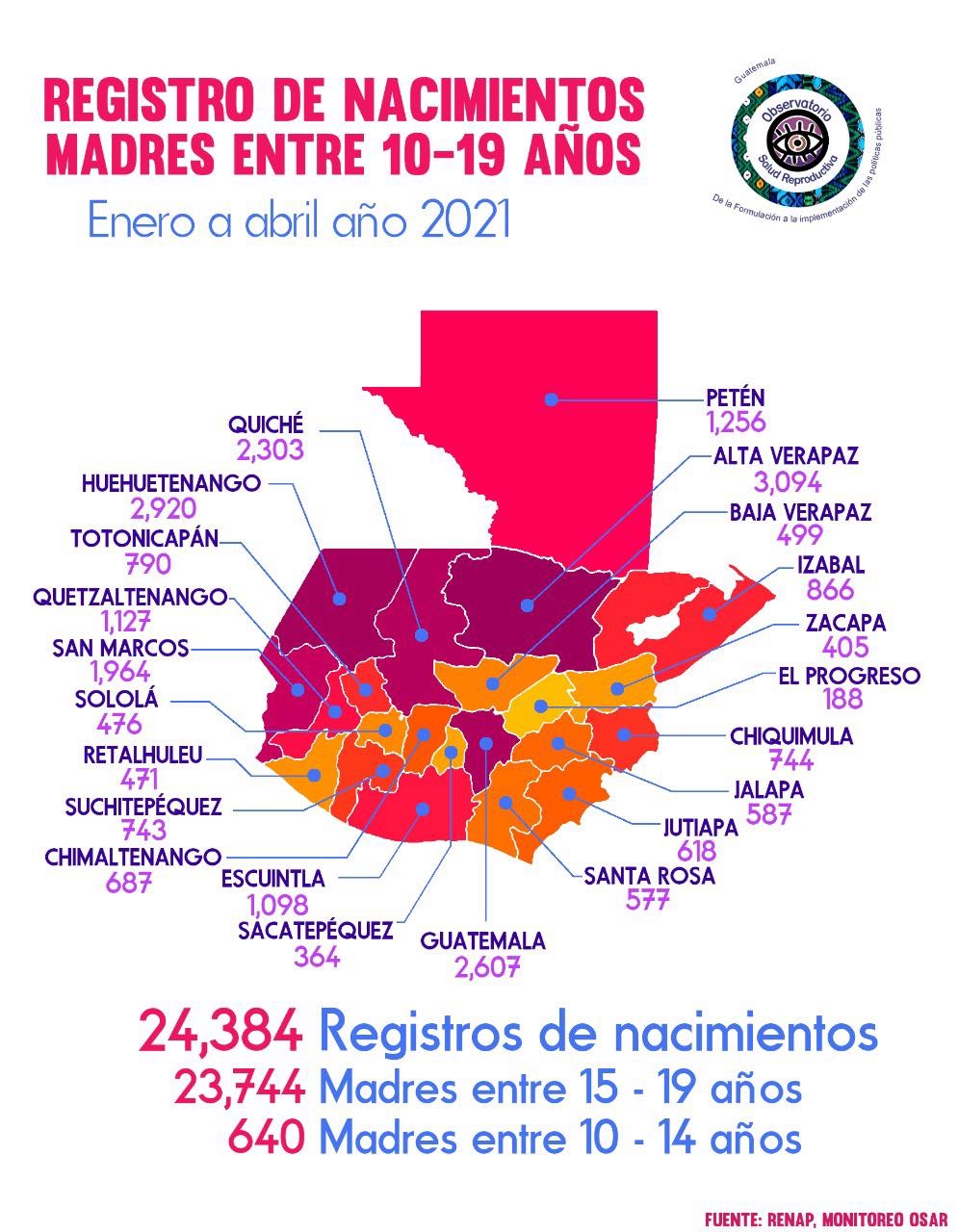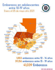 Mientras que los departamento registrados con menores casos son el Progreso 418 e embarazos de niñas adolescentes y mujeres de 10 a 19 años, Sacatepéquez, Zacapa Retalhuleu.
