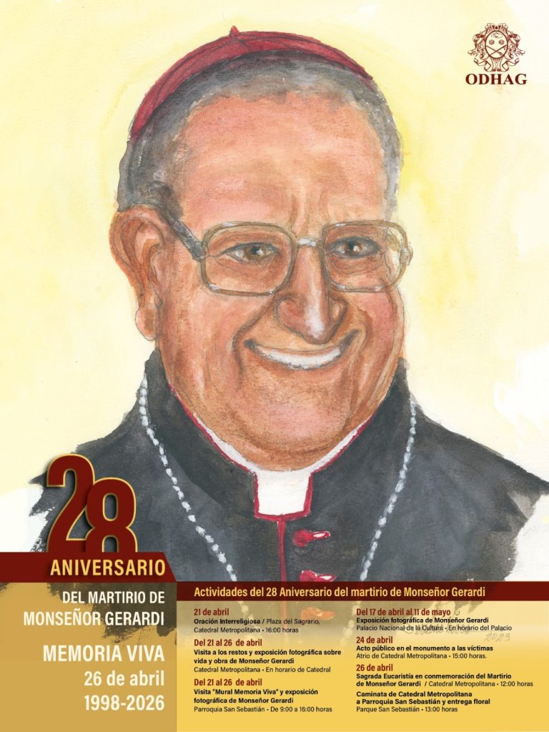 Han pasado 28 años de su fallecimiento y la Oficina de Derechos Humanos del Arzobispado de Guatemala, el Movimiento Monseñor Gerardi, Sector Interreligioso Centinelas, Conferencia de Religiosos de Guatemala CONFREGUA y otras organizaciones sociales se unen a la conmemoración de quien señalan que en vida fue un amante de la verdad y de la paz.