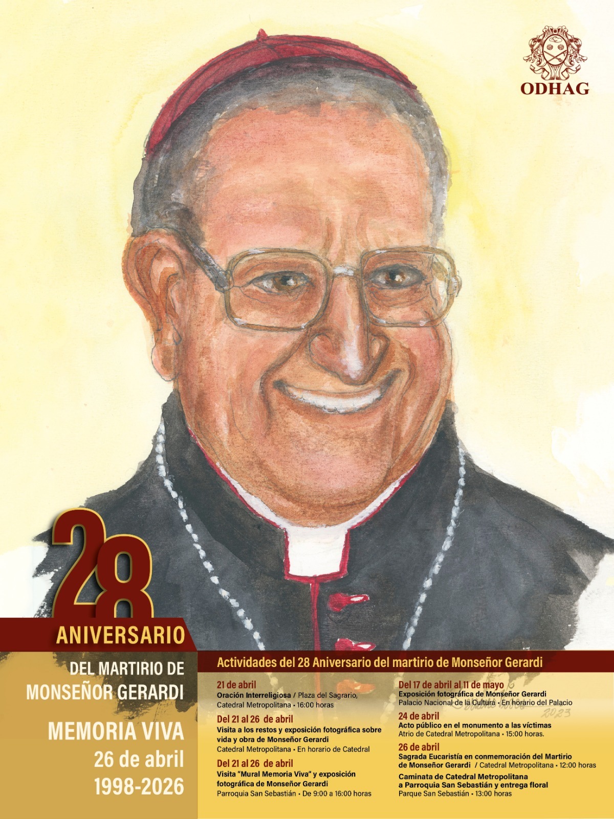 Monseñor Juan José Gerardi Conedera fue el primer coordinador de General de la Oficina de Derechos Humanos del Arzobispado de Guatemala ODHAG, donde promovió el proyecto interdiocesano de Recuperación de la Memoria Histórica (REMHI) cuyo informe se nombró “Guatemala Nunca Más” el cual se presentó en la Catedral Metropolitana de Guatemala un 24 de abril de 1998, dicho documento contenía información sobre violaciones de derechos humanos cometidas durante el conflicto armado (1960-1996) responsabilizando en su mayoría a las fuerzas de seguridad de los crímenes cometidos, dentro de ellos las 200 mil personas que perdieron la vida y las mas de 45 mil personas desaparecidas que hasta el día de hoy siguen sin aparecer.