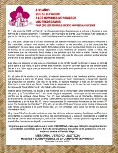 En un comunicado Creompaz manifiestan «el primero de junio de 1982, el Ejército de Guatemala llegó directamente a torturar y llevarse a una familia de la aldea «poqomchi’ “Pambach”, del municipio de Santa Cruz Verapaz, Alta Verapaz, el padre, la madre y sus dos hijos continúan desaparecido desde ese entonces».