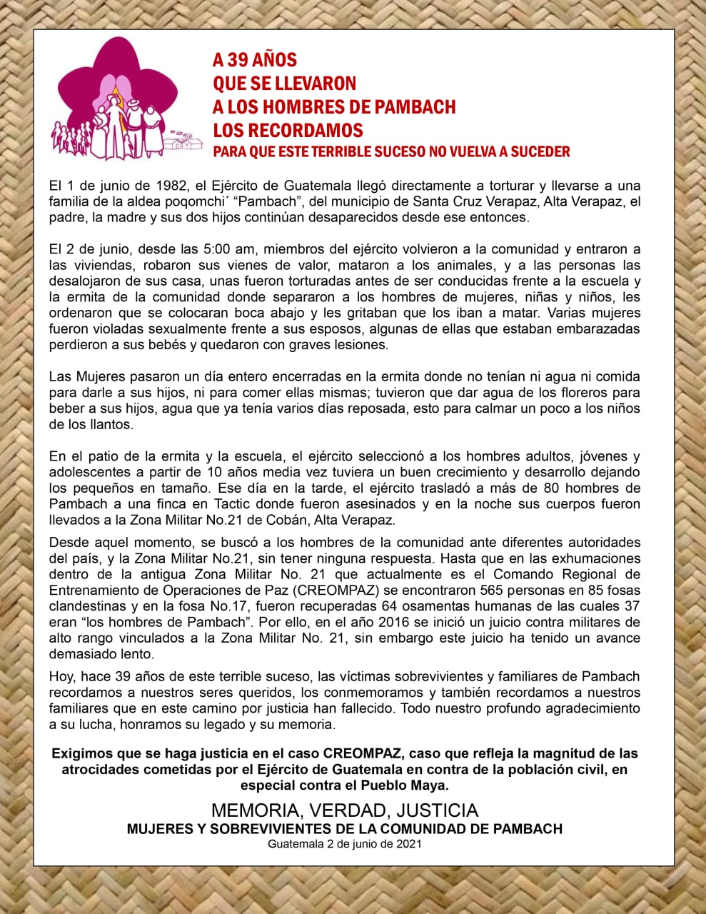 En un comunicado Creompaz manifiestan «el primero de junio de 1982, el Ejército de Guatemala llegó directamente a torturar y llevarse a una familia de la aldea «poqomchi’ “Pambach”, del municipio de Santa Cruz Verapaz, Alta Verapaz, el padre, la madre y sus dos hijos continúan desaparecido desde ese entonces».