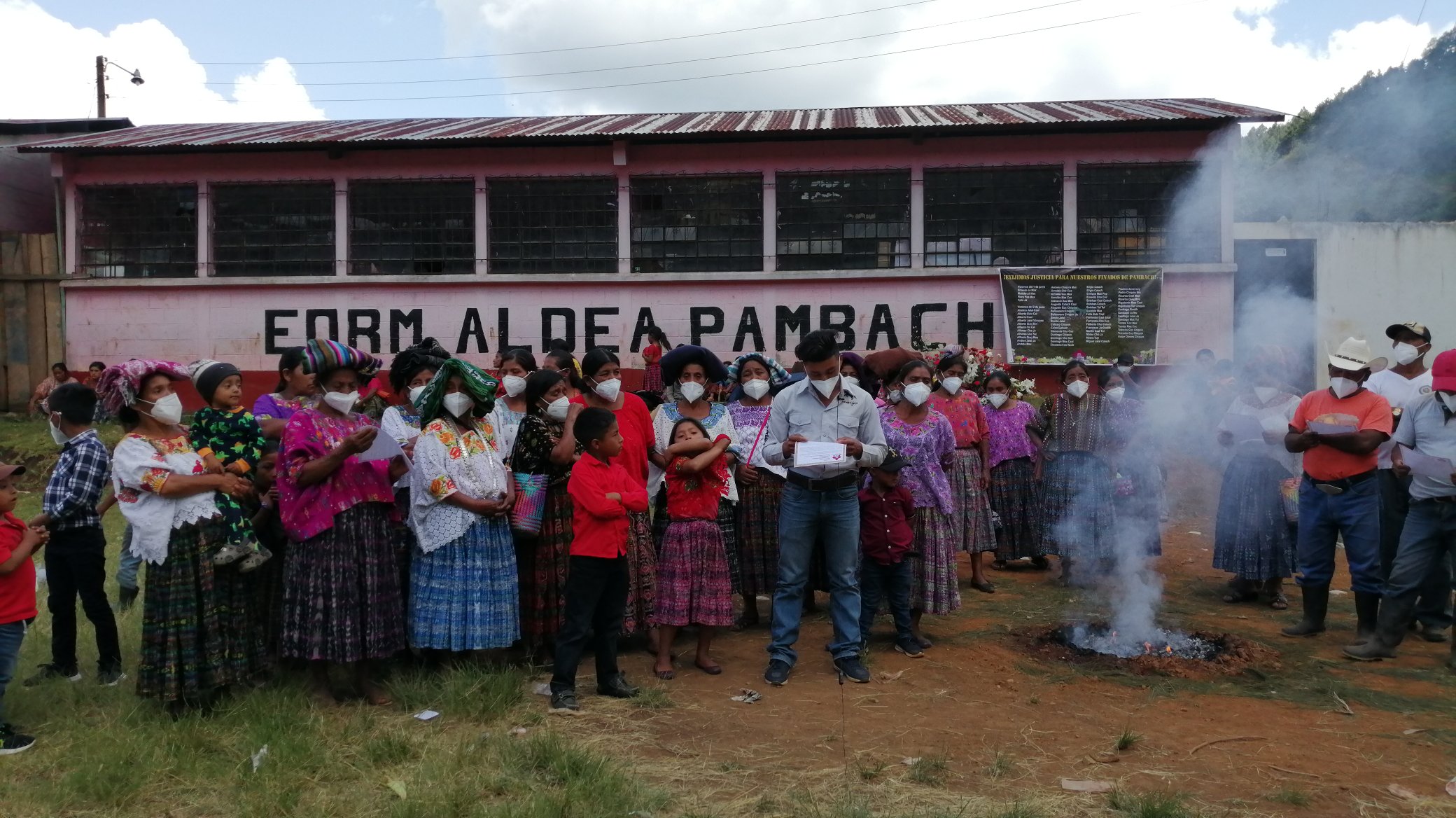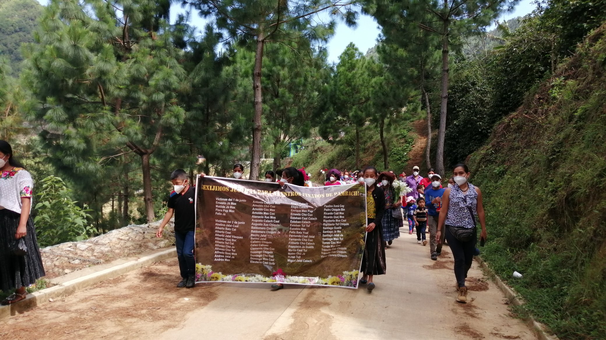 «Desde aquel momento, se buscó a los hombres de la comunidad ante diferentes autoridades del pais, y la zona militar No 21, sin tener ninguna respuesta hasta que en las exhumaciones dentro de la antigua zona militar 21 que actualmente es el comando Regional de Entrenamiento de Operaciones de Paz (CREOMPAZ) se encentraron 565 personas en 85 fosas clandestinas y en la fosa No 17, fueron recuperadas 64 osamentas humanas de las cuales 37 eran “los hombres de pambach’. Por ello, en el año 2016 se inició un juicio contra militares de alto rango vinculados a la zona militar no 21, sin embargo este juicio ha tenido un avances demasiado lento».