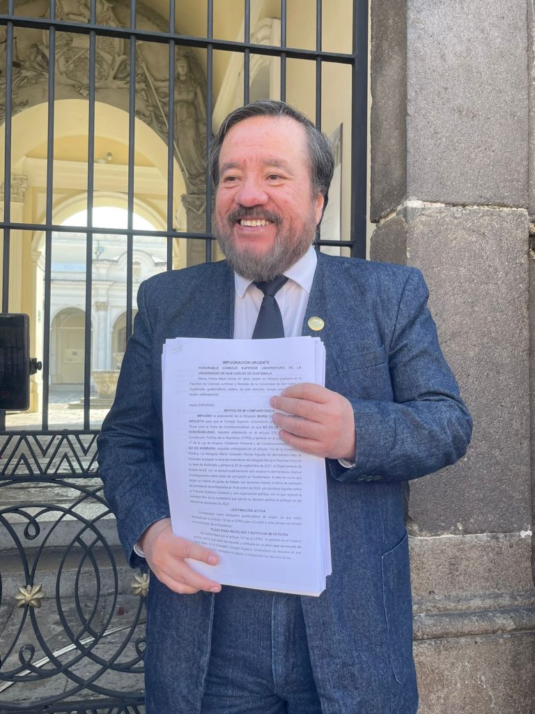 Frente al Museo de la Universidad de San Carlos de Guatemala, el doctor en derecho Marco Vinicio Mejía, presentó impugnaciones contra la actual fiscal general de Ministerio Público María Consuelo Porras Argueta y la Magistrada de la Corte de Constitucionalidad Leyla Susana Lemus candidatas a ser designadas magistradas titulares de la Corte de Constitucionalidad por parte del Consejo Superior Universitario