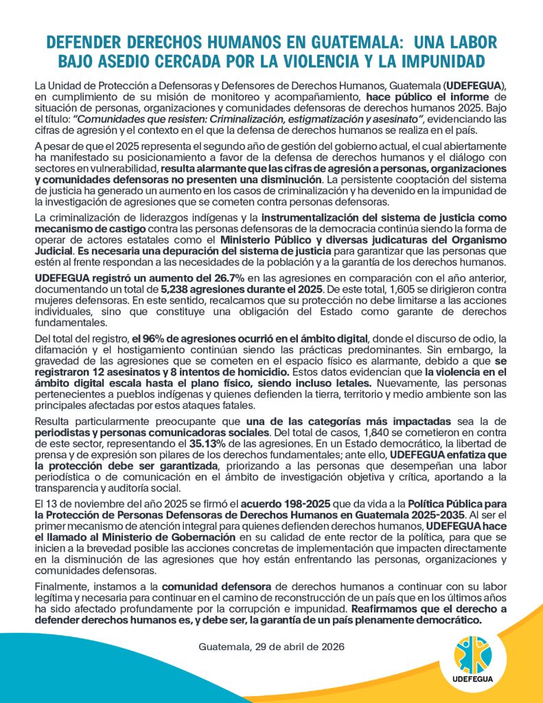 Esto refleja el informe anual 2025 de la Unidad de Protección a Defensoras/es de DDHH en Guatemala (UDEFEGUA), publicado el miércoles 29 de abril. Un registro amplio de las agresiones cometidas contra personas u organizaciones que defienden Derechos Humanos o territoriales en Guatemala.
