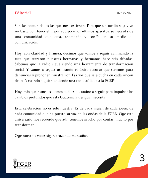 Estamos a tan solo unos días de celebrar el sexagésimo aniversario de vida radiofónica de la Federación Guatemalteca de Escuelas Radiofónicas –FGER–. Este logro, lo celebramos soñadoras y soñadores que, con esperanza y compromiso, hemos asumido la tarea de encaminar y liderar el sueño que, en su momento, fue de seis radios. Hoy nos alegra decir que ya no somos solo seis o siete: somos más de treinta emisoras en todo el país, transmitiendo las voces, sentires y luchas de cientos y miles de personas.