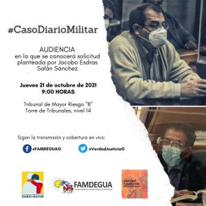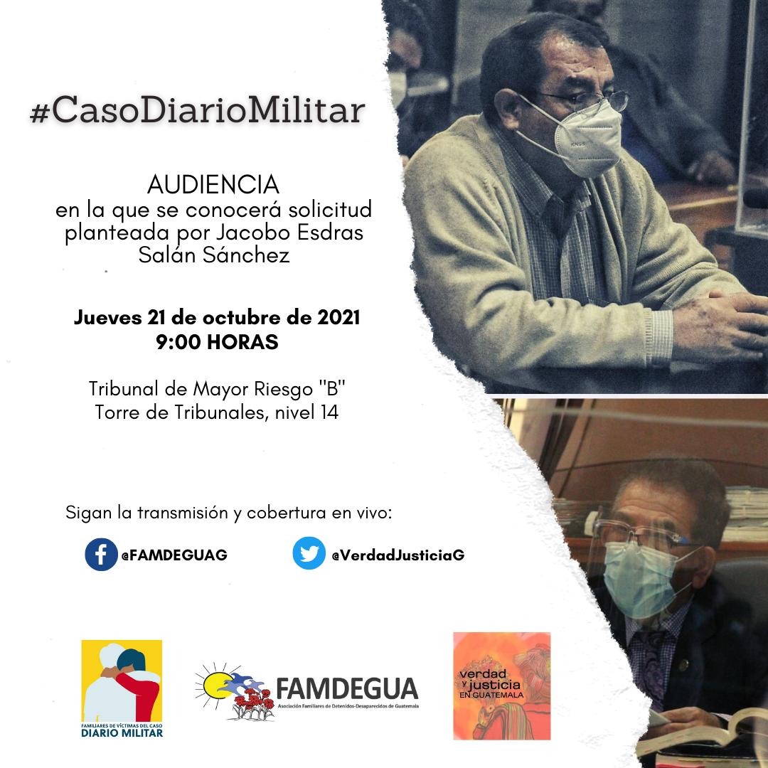 Este jueves 21 de octubre el abogado Herrera López presento una solicitud del ex militar Jacobo Esdras Salán Sánchez, uno de los 11 ligados a proceso por desaparición forzada, asesinato, asesinato en grado de tentativa en el Caso Diario Militar.