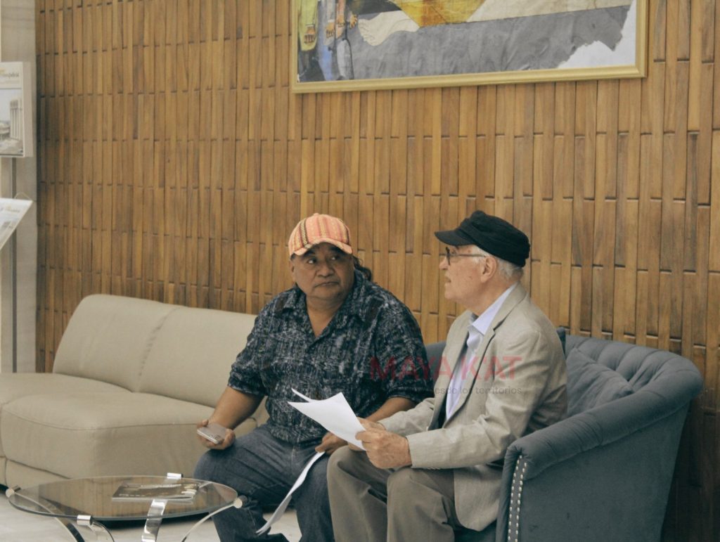 Bernardo Caal y Ramón Cadena en espera para hacer entrega de memorial por Carolina Sinay