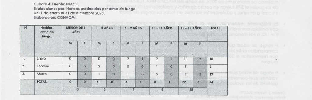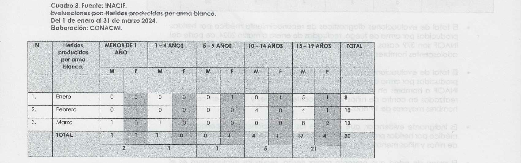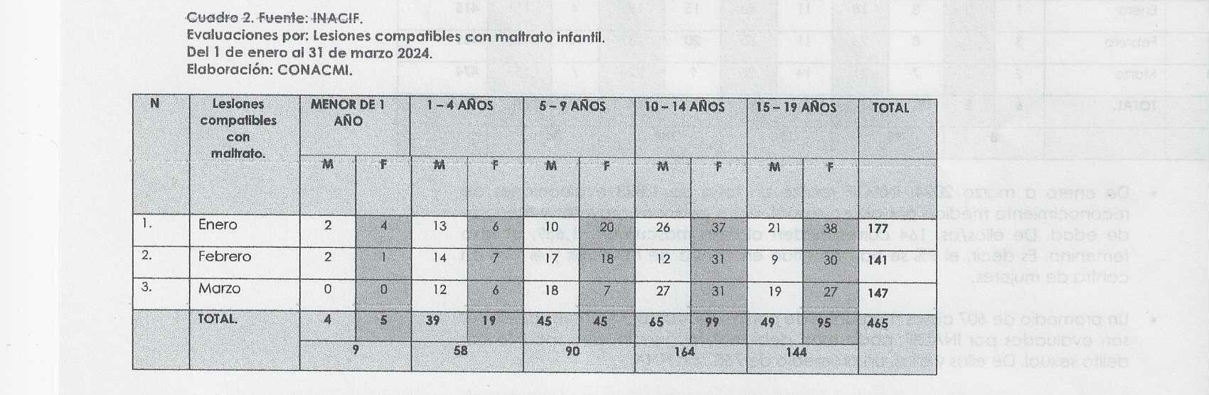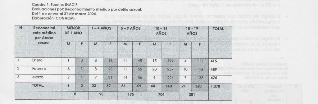 Según COMACMI, entre los meses de enero a marzo de 2024, el Instituto Nacional de Ciencias Forenses INACIF, realizó un total de un mil 378 evaluaciones de reconocimiento médico por delito sexual a niñas, niños y adolescentes; de esas evaluaciones, un nueve por ciento corresponde a niños y adolescentes varones.