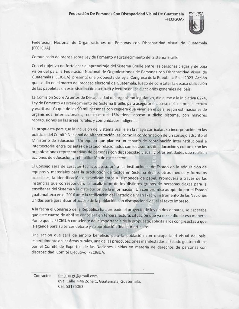 La Federación Nacional de Organizaciones de Personas con Discapacidad Visual de Guatemala-FECIGUA, solicitó el cinco de abril de 2024 al Congreso de la República, la aprobación de la Ley de Fomento y Fortalecimiento del Sistema Braille.