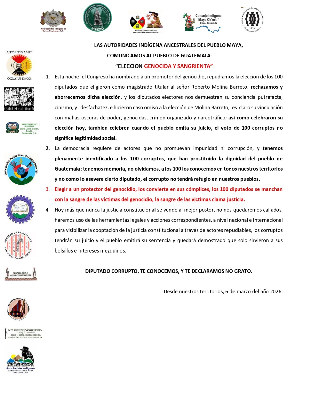 «Molina Barreto es la cara del genocidio y la impunidad en Guatemala. Como víctimas del CAI, rechazamos esa actitud del Congreso.»