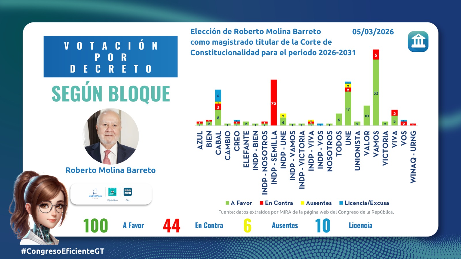 Durante su 14 sesión ordinaria, los diputados reeligieron a Roberto Molina Barreto para continuar como magistrado titular, y a Luis Alfonso Rosales Marroquín para continuar como magistrado suplente de la más alta corte del país, que es la «garante del orden constitucional de Guatemala».