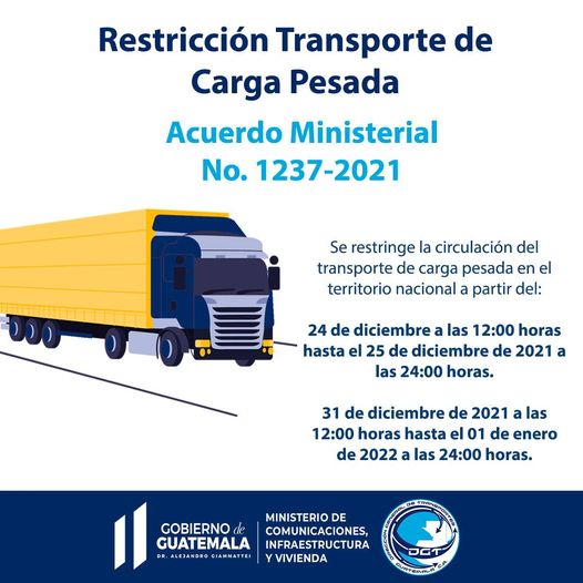 El Ministerio de Comunicaciones, Infraestructura y Vivienda, a través del acuerdo ministerial número 1213-2021, restringe la circulación del transporte de carga por todo el territorio nacional por un total de setenta y dos horas. La medida busca beneficiar a la circulación de vehículos livianos y fomentar el turismo.