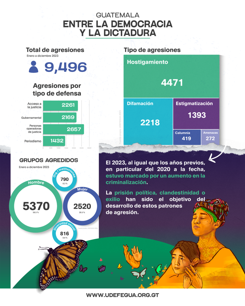 La Unidad de Protección a defensoras y defensores de Derechos Humanos de Guatemala (UDEFEGUA) hizo público su informe del año 2023, sobre sus registros de agresiones en contra de personas, organizaciones y comunidades defensoras de derechos humanos en Guatemala.