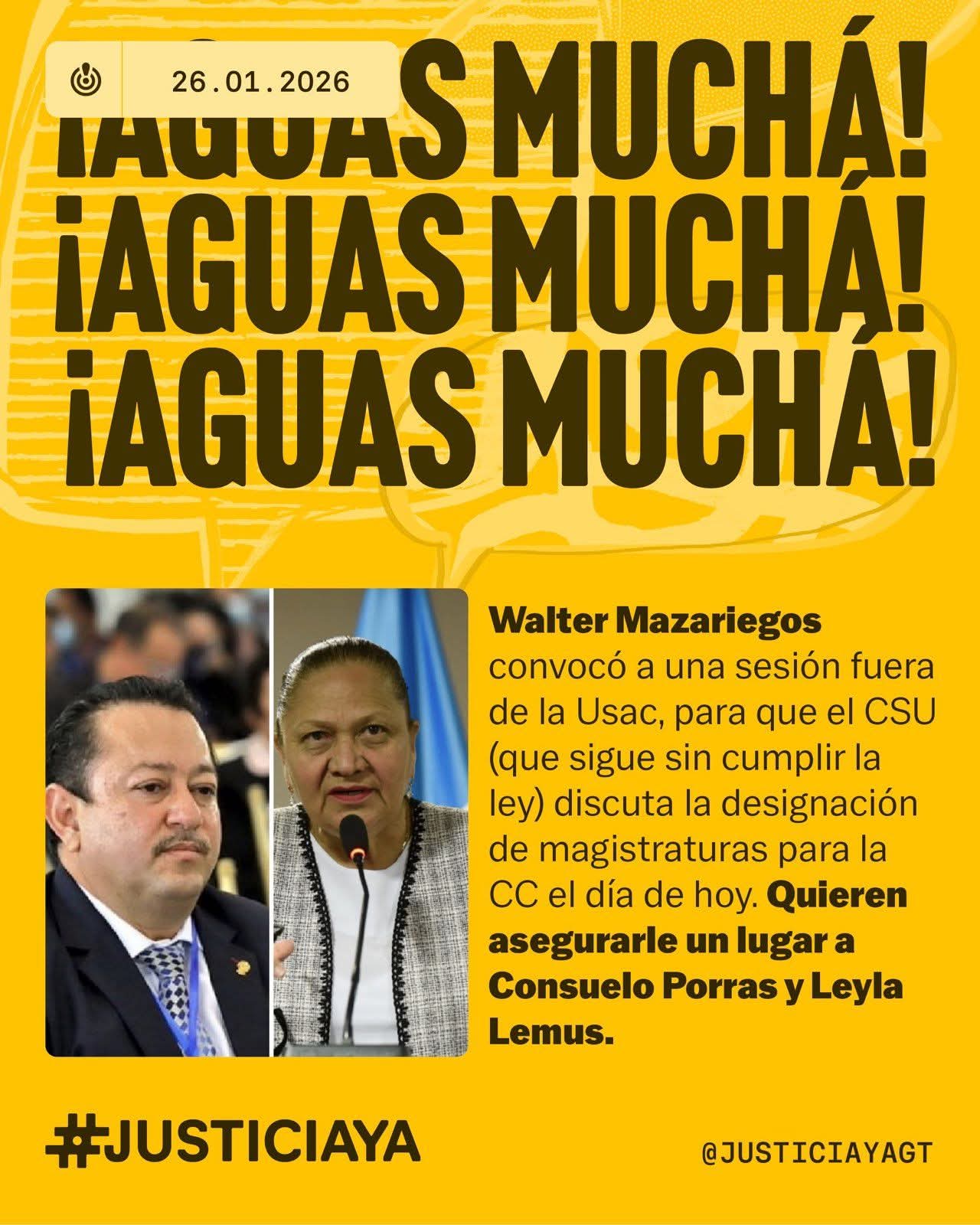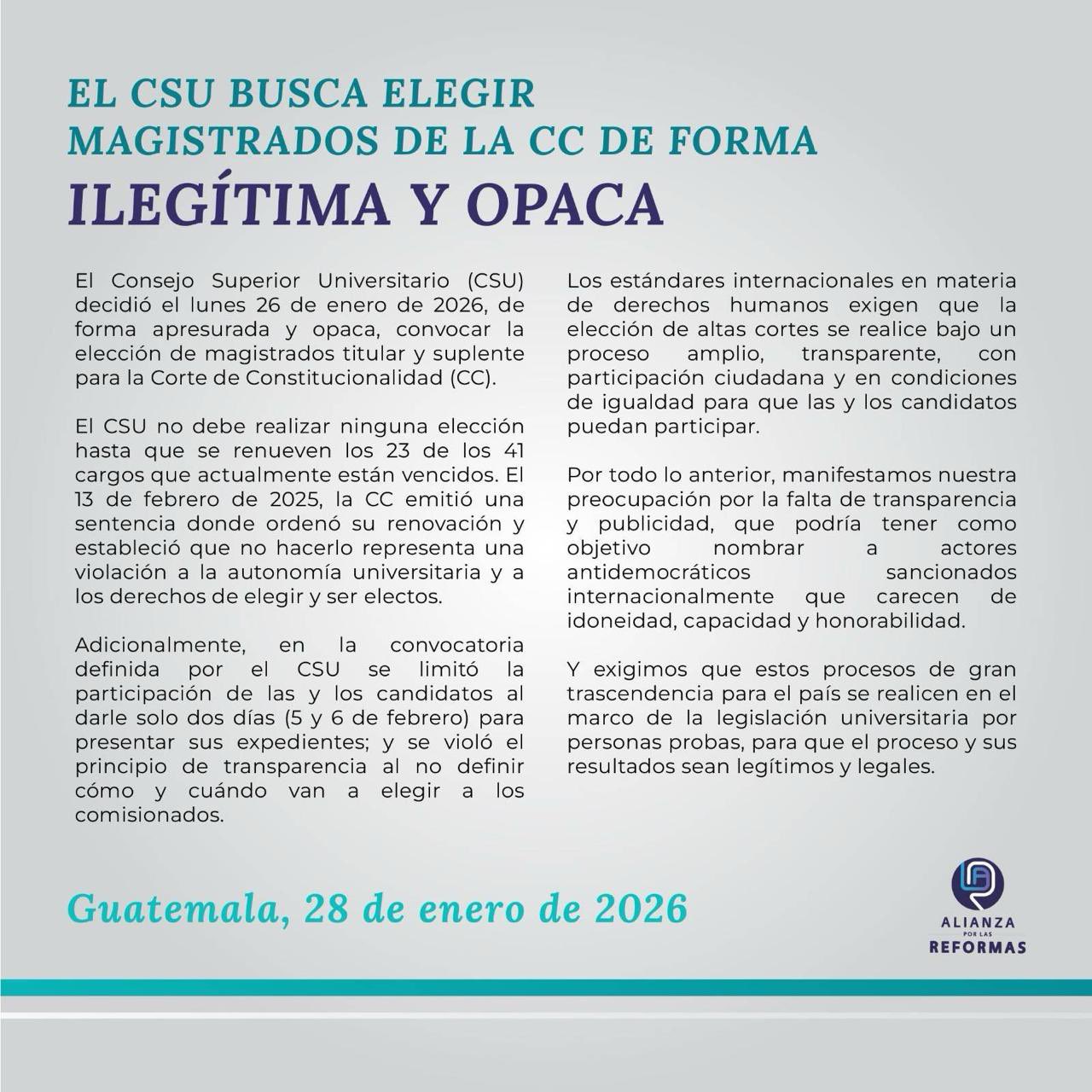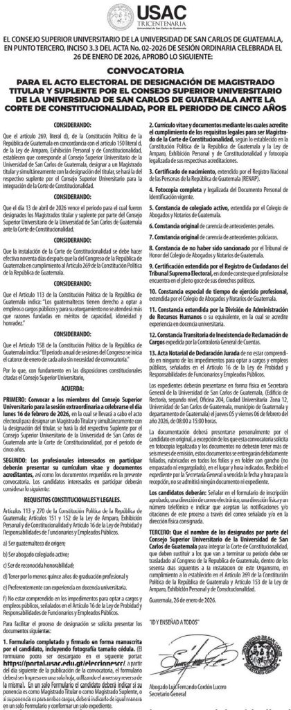 Diferentes abogados y diputados han interpuesto ya cuatro amparos en contra del CSU por esas plazas vencidas, y contra la convocatoria oficial que realizó el pasado 26 de enero del 2026, para elegir a un magistrado titular y a uno suplente para la CC, que es la «entidad garante del orden constitucional de Guatemala».